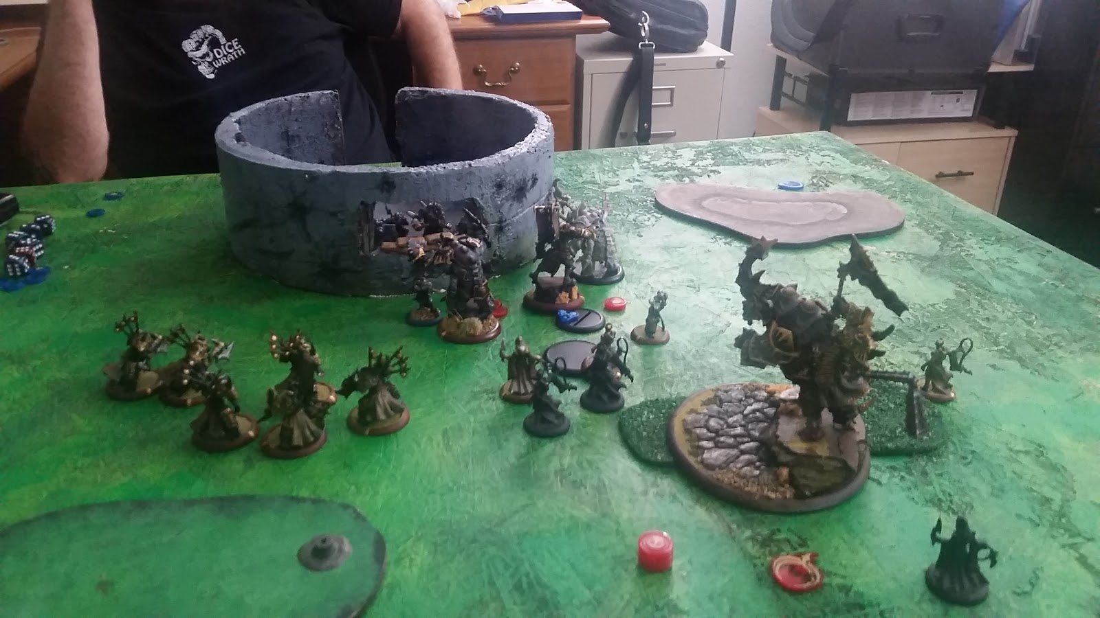 I've been getting a little bored with Khador lately so I asked Austin to bring some of his Skorne so I can use them to play against his Cygnar. He also made an awesome Bunker structure for the Company of Iron league.